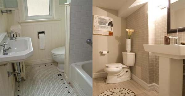 En la primera fotografía vemos claramente un baño bastante antiguo, pero con unas cuantos retoques se le ha dado un aspecto muy actual. Se ha tirado parte del tabique para colocar una mampara de dos hojas de cristal, consiguiendo más amplitud. También se ha cambiado el suelo, el lavabo y el resto de muebles, eliminado los azulejos y pintado de un color claro para una mayor luminosidad.